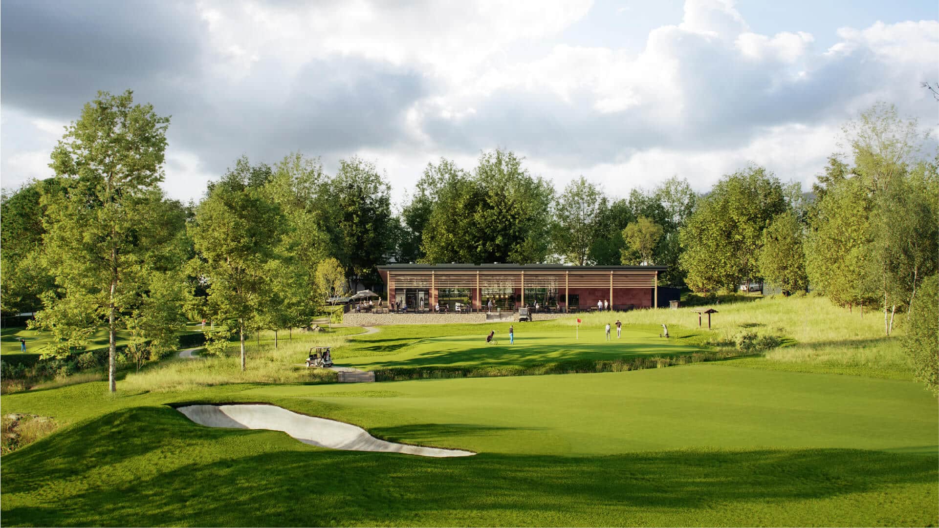 In this updated masterplan from Liverpool-based architects Brock Carmichael, there are several key changes. These include a redesigned clubhouse, improved Hay Loft function space, and an extended terrace to improve the social space at the club. A new lake, drainage balancing pond, and the relocation of a future adventure golf course to an area adjacent to the clubhouse are also planned.